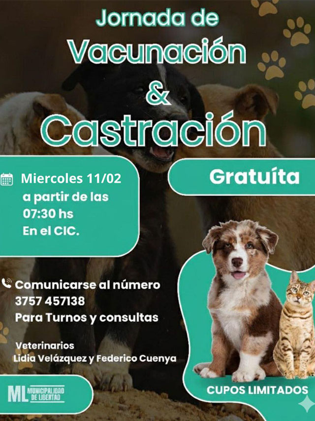 La Municipalidad de Libertad anunció la realización de una jornada especial de atención veterinaria que tendrá lugar el miércoles 11 de febrero, a partir de las 7:30 horas, en el Centro Integrador Comunitario (CIC). La iniciativa busca garantizar el acceso gratuito a servicios de vacunación y castración, entendiendo que el cuidado de los animales forma parte esencial de la salud pública y del bienestar colectivo.